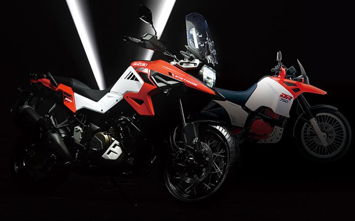 右が1988年に発売された「DR-BIG(DR750S)」で、左が新型「Vストローム1050XT」。各部のラインに共通したものが感じられる