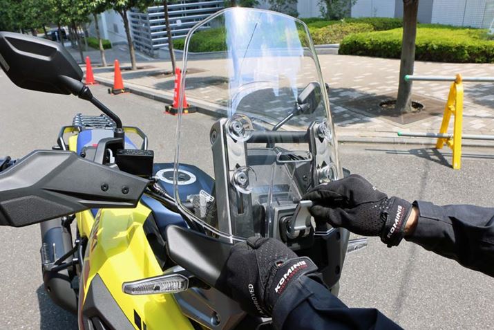 ただ、スクリーンの高さ調節は電動ではなく手動なうえ、バイクにまたがったままだとむずかしい。前に回り込まなければならないのは少々手間かも