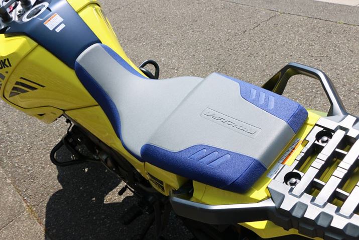 タンクは大きめだが、シートの横幅はスリム。この絞り込まれたシートと横幅の小さいなV型エンジンが足つき性やスタンディングのしやすさに効いている