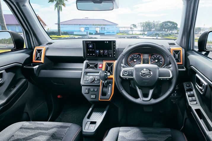 タフトの内装は、細かな個所までスクエア基調で構成されており、タフなイメージを想起させるデザインとなっている。インパネ中央のシフト周りやメーター、エアコン吹き出し口などに配されているオレンジの加飾は、G、Gターボに標準装備されるものだ。