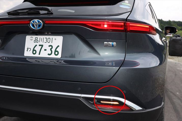 トヨタ 新型「ハリアー」のウインカーは、赤丸の部分が光ります。ちなみに、ナンバーが「わ」ではありますが、車両はレンタカーではなく、メディア参加の試乗会で用意された車両になります