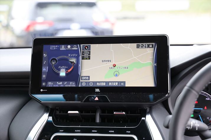 新型ハリアーのZグレードには、12.3インチの大画面ディスプレイを採用した「T-Connect SDナビゲーションシステム」が標準搭載されています。ナビやTV、オーディオからエアコンやシートヒーター、ハイブリッド車ではエネルギーフローなど、さまざまな表示や設定が可能となっています。