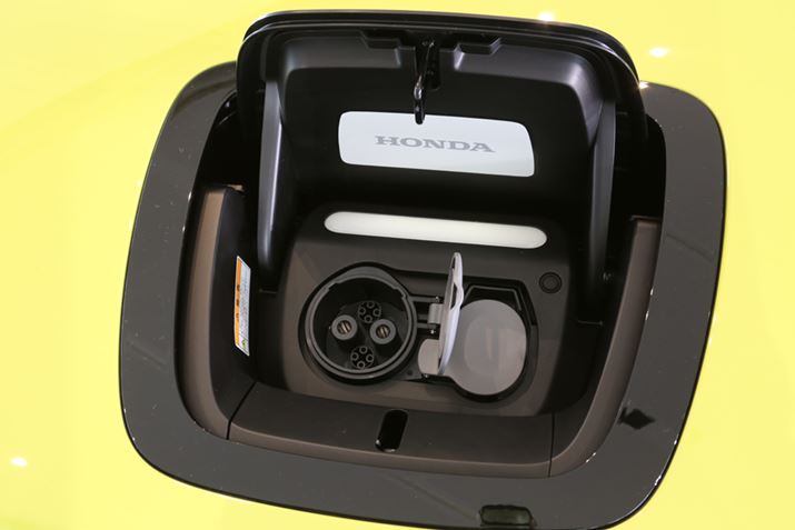 「Honda e」の充電口は、ボンネットのフロント中央に備え付けられている。左が、急速充電ポートで、右が普通充電ポートだ