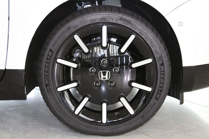 「Honda e」17インチホイールには、ミシュラン「PILOT SPORT 4」タイヤが装着されており、走行性能の高さをうかがわせる
