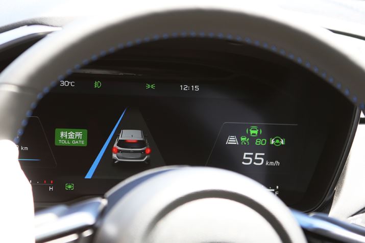 アイサイトXでは、「アクティブレーンチェンジアシスト」機能が搭載されている。同機能は、ACC作動中にウィンカーを操作するだけで、ドライバーがステアリングを動かさなくても車線変更してくれるという機能だ(70km/h〜120km/hで作動)。さらに、同じくACC作動中にコーナー前に適正な速度まで減速してくれる「カーブ前速度制御」機能や、料金所の手前で速度を落としてくれる「料金所前速度制御」機能も加わった。