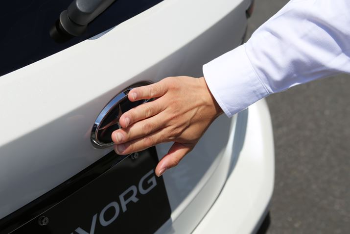 GT-Hグレード以上で採用されている電動リヤゲートの「ハンズフリー」機能は、キーを携帯しながらヒジなどをリヤゲートのエンブレムに近づけると作動する。ハンズフリーは、リヤゲートの下で片足を出し入れする方式が一般的だが、開発者は「荷物を両手で持ちながら片足で立つと、路面が滑りやすい場合、お客様が転ぶ心配も生じる。そこで、足を路面から持ち上げずに開けられるようにした」と言う。