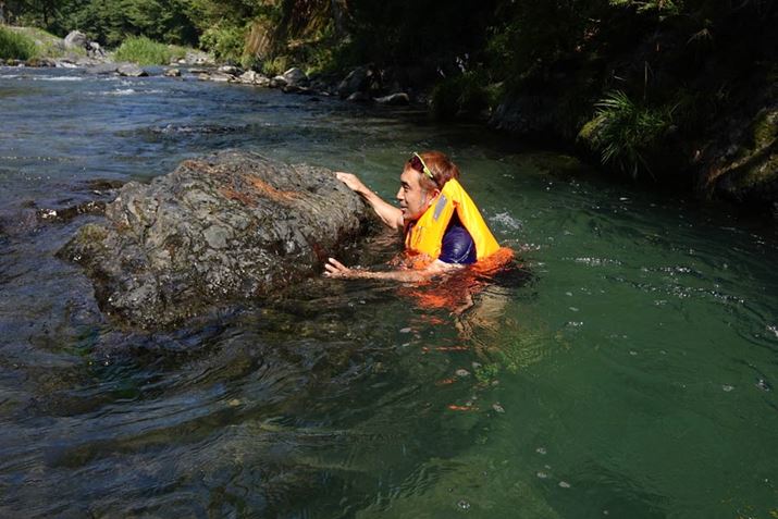 テストを実施した場所は、渓流によくある川遊び場。流れの強さは家族連れが普通に川遊びを楽しめる程度ですが、一部にはそこそこ流れが強く、大人でも足が川底に届かない場所もあります
