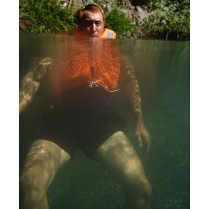 川の中に入ると、一般的な浮き輪やレジャー用のフローほどの浮力感はありませんが、上半身を浮かせる効力は確かに発揮されます。どんな姿勢をとっても首から上は常に水面上にとどまるので、全身が沈むことや、水を飲んでしまうことによる精神的パニックを防ぐ効果は高いと感じました。