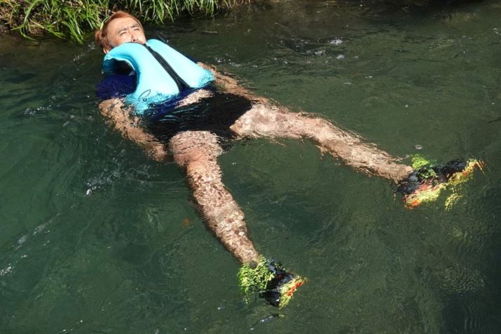 足を水面近くにする姿勢をとっても身体は転覆せず、首から上は水上にとどまります(※安全が確認できる場所で撮影しています。以下同)