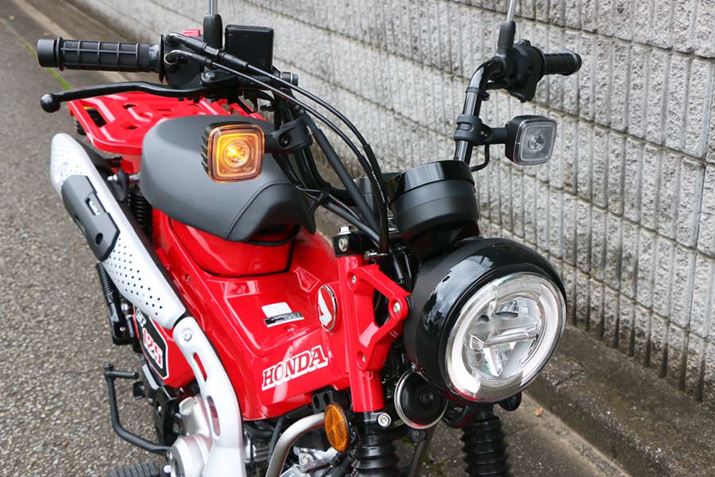 ホンダ CT110の赤く塗られたヘッドライトステーへのオマージュが感じられる