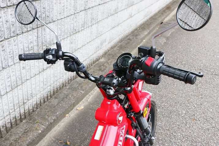 丸型のミラーもホンダ CT110のイメージに寄せられている。メーターはシングルタイプで、スッキリとしたコックピットを実現