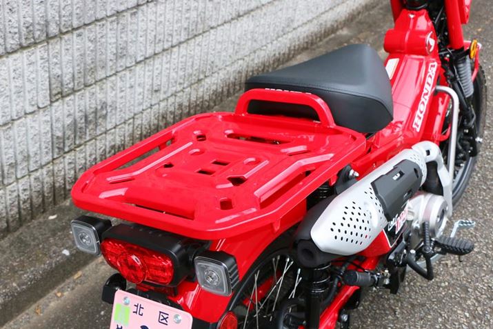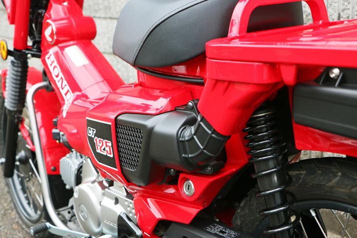 エアクリーナーの導入口はリアのキャリア部分に設けられている。これも、ホンダ CT110で採用されていたシステムだ