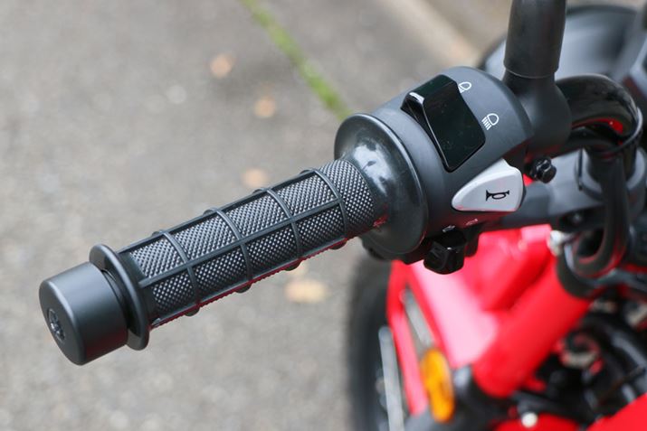 グリップは、オフロードバイクに採用されるリブが立っていて滑りにくいタイプ。スーパーカブシリーズに共通する自動遠心クラッチなので、クラッチレバーは存在しない