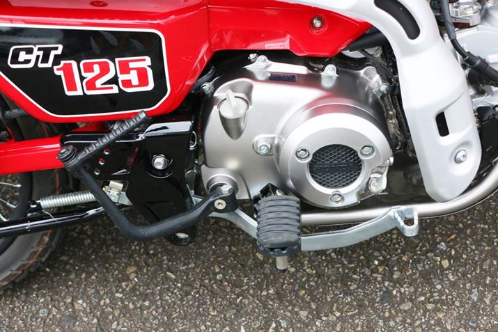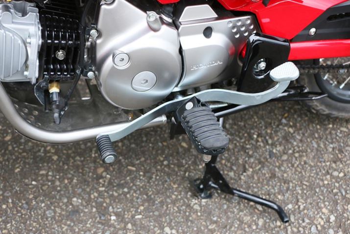 シフトパターンはスーパーカブシリーズ共通のロータリー式だが、シフトペダルの前側は、一般的なバイクのものと同様につま先でかき上げる操作も可能な形状