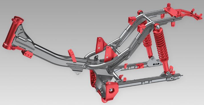 フロントフォークのマウント方式がベース車のものと変わったこともあり、CT125・ハンターカブはフレームにも手が加えられている。赤い部分が、スーパーカブ C125からの変更点だ