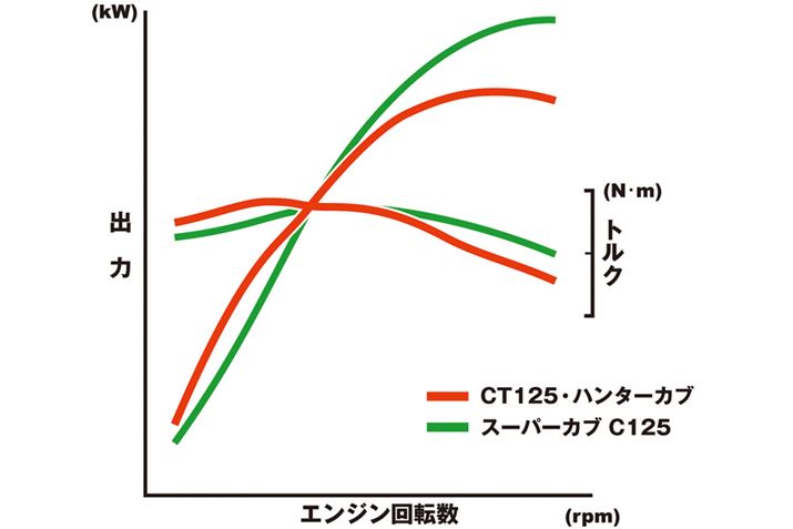 スーパーカブ C125とCT125・ハンターカブの出力特性比較図。CT125・ハンターカブのほうが最高出力は抑えられているが、低回転での力強さを重視していることがわかる