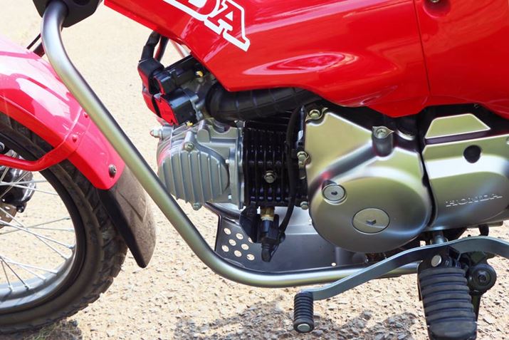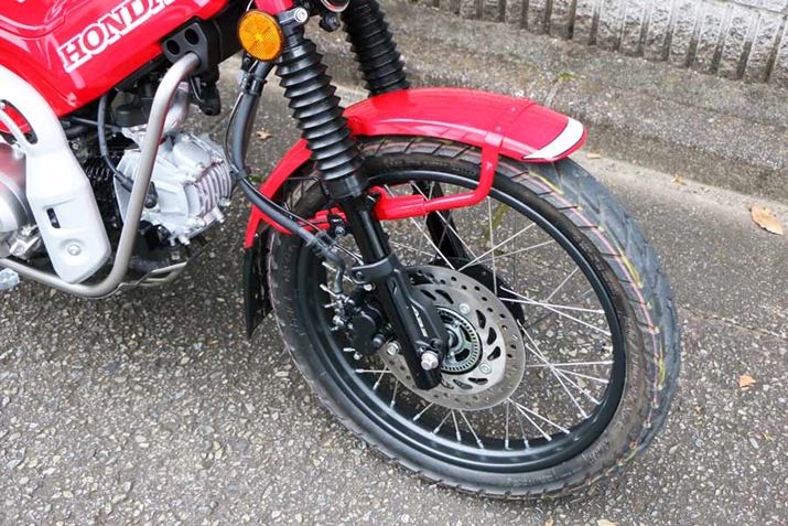 このように、ホンダ CT110をイメージさせる外観だが、ベース車は2019年に発売された「スーパーカブ C125」。124ccのエンジンの最高出力は8.8PS/7,000rpmと、9.7PS/7,500rpmのスーパーカブ C125より抑えめとしながら、最大トルクは11Nm/4,500rpmと、スーパーカブ C125の10Nm/4,000rpmよりも低回転で強いトルクを発生する特性とされた。また、フロントフォークがテレスコピック式なのはスーパーカブ C125と共通ながら、ハンドルをマウントするトップブリッジの位置まで伸ばされ、ストローク量も10mm増した110mmとなり、ギャップの多い路面をより走破しやすくなっている。ブレーキも前後ともにディスク式となっており(スーパーカブ C125はリアブレーキがドラム式)、制動力やコントロール性が向上。さらに、未舗装路での走行を視野に入れ、ホイールベースが10mm延長されたほか、シート高も20mm高められ、フレームの剛性も最適化されている。
