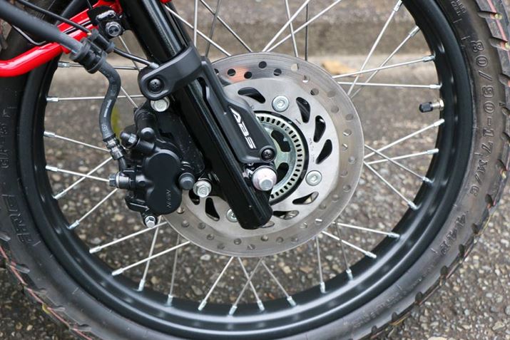 ABSに対応したフロントディスクブレーキには、片押し式の2ポッドキャリパーを装備。ホイールはオフロードバイクらしいスポークタイプだ