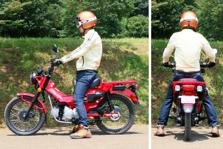CT125・ハンターカブにまたがってみると、身長175cmの筆者で両足のかかとがギリギリ接地しない感じだった。シリーズの中ではもっとも高いシート高だが、足つき性は悪くない