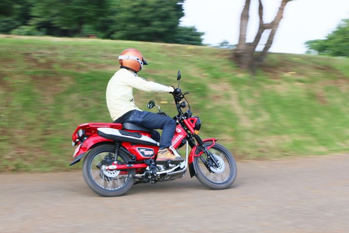 車体の剛性感も十分あり、サスペンションもよく動くので、大きめのギャップを乗り越えても車体が振られることもない。オフロードバイクっぽくステップの上に立ち上がって乗ってみると、腰の下でショックを吸収しながら走ることができた。そして、前後に採用したディスクブレーキは、クロスカブ110の前後ドラムブレーキよりも断然高いブレーキの効きとコントロール性を発揮。グリップの低い未舗装路でも、安心して速度コントロールが可能だ。また、リアにABSが装備されていないので、後輪をロックさせて向きを変えるような乗り方ができるのも気がきいている。