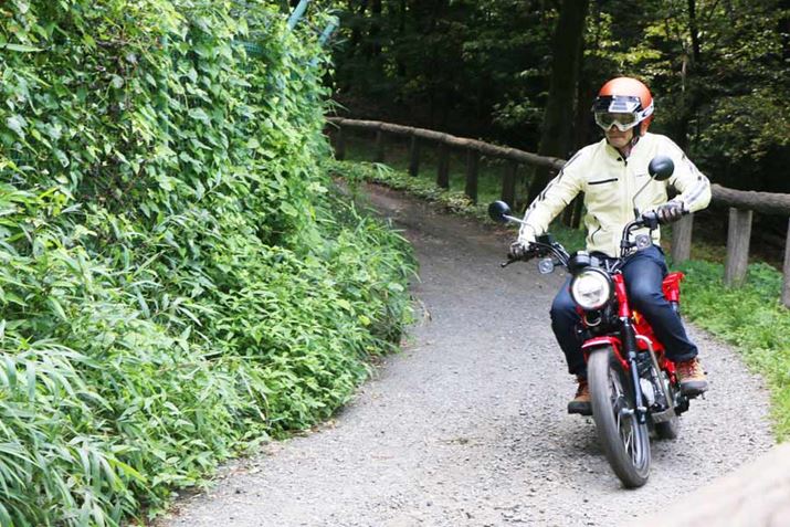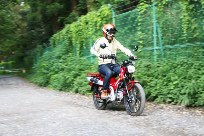 そして、オフロードを走行すると、CT125・ハンターカブのさらなる懐の深さにトリコになるはず。低回転のトルク重視に振った124ccのエンジンは、フラットな林道を積極的に楽しみながら走るのに最適な特性。車体の剛性感は増しているものの、前後のサスペンションはよく動くので、スピードを出さなくてもオフロードのおもしろさを満喫できる。これまでオフロードを走ったことがない人でも、CT125・ハンターカブなら怖さよりも楽しさを体感できるだろう。林道をかっ飛ばすような走りはできないが、ベテランライダーが乗っても、初めてオフロードを走った時に感じた気持ちよさがよみがえり、また違った楽しさが味わえるかもかもしれない。