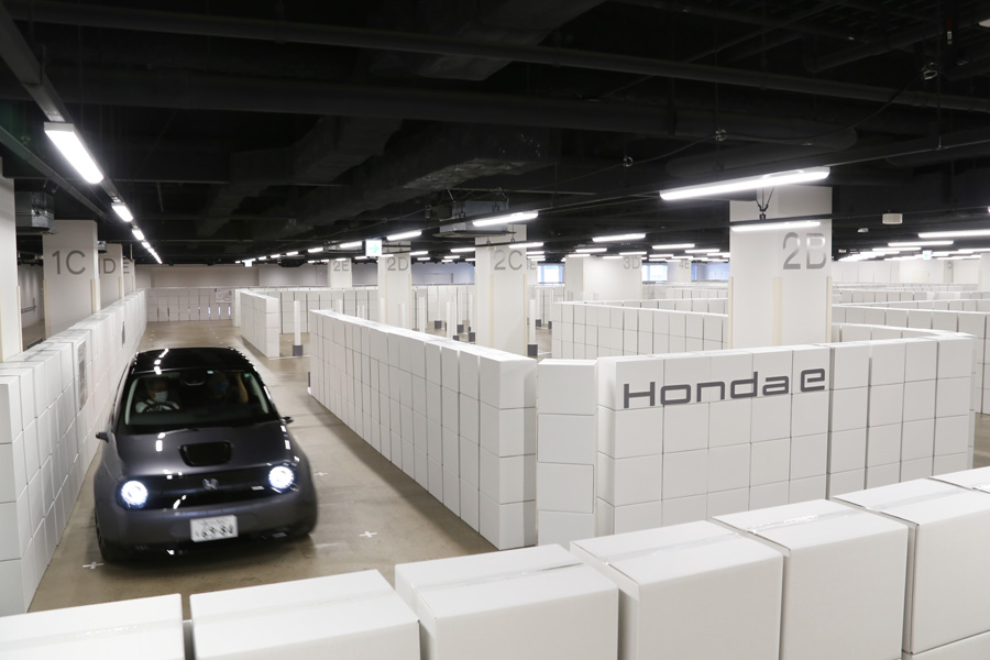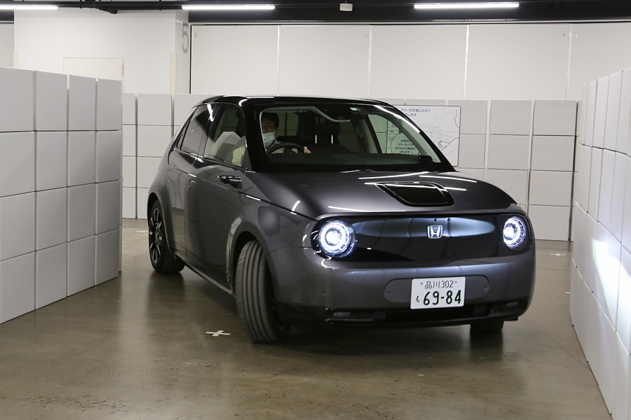 今回の「Honda e」試乗会では、ホンダが用意した狭い路地を再現した特設コースを試乗することもできた。かなり狭く、コンパクトカーでも壁に当たってしまいそうなほどに狭いコースなのだが、切れ角が大きくて見切りのいいHonda eなら、すいすいと進んでいける