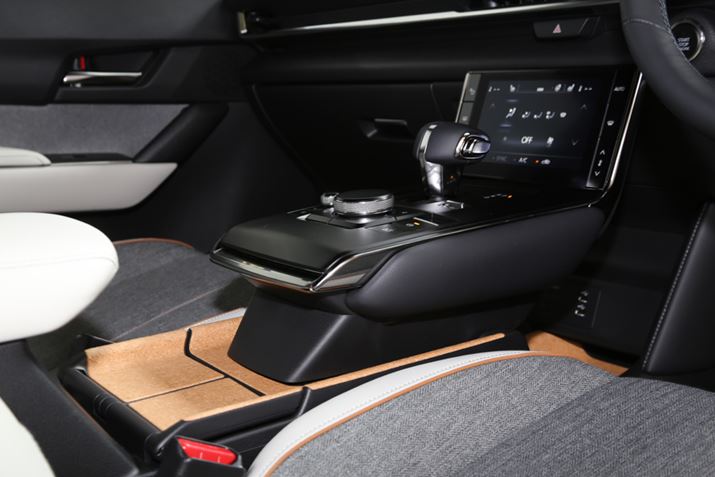内装で注目したいのが、センターコンソールの装飾だ。上下2段に分けられ、下にはコルクが貼られている。これは、マツダの前身が東洋コルク工業であったことにも由来する。コルクは、樹皮から作られるので樹木を伐採しない。さらに、MX-30に使われるのは、従来はムダになっていたコルク栓を製造して余った部分で、環境負荷が抑えられていると言う。