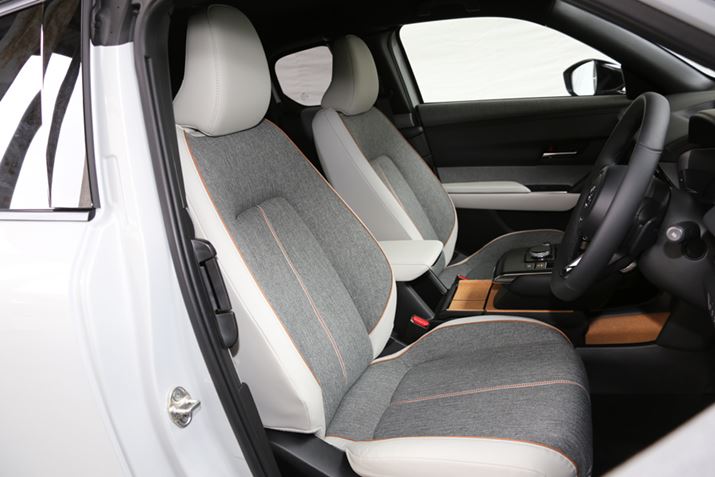 シート表皮は、クロスや合成皮革を仕様に応じて使いわけているが、いずれも伸縮性があって座り心地はしなやかだ。リラックス感覚がともない、MX-30のコンセプトに合っている。
