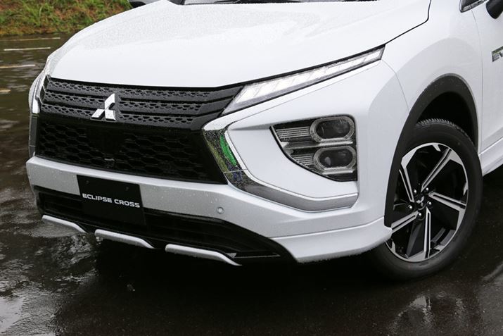新型「エクリプスクロス」のフロントフェイス。マイナーチェンジ後は、ヘッドライトの位置が「デリカD:5」や「eKクロス」などと同様、通常はフォグランプが存在する中央サイドの位置へと変更されている