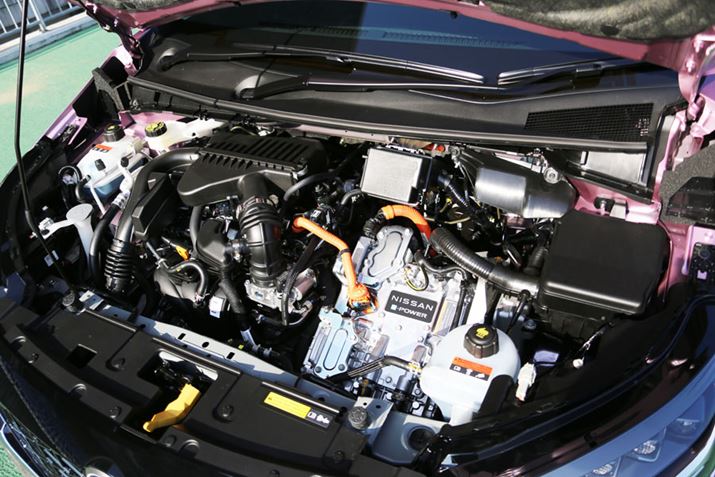 発電機を作動させるエンジンは、従来と同様のHR12DE型 1.2L直列3気筒エンジンが採用されている。発電時には、エンジンが作動することで相応のノイズ音を発生させるが、新型ノートではエンジン音の対策も施されている。それが、路面状況に応じた発電制御システムだ。同システムは、路面状態と車速によってロードノイズが大きいと判断すると、エンジンを積極的に作動させて早めに充電させるというもの。ロードノイズが大きければ、エンジン音のノイズも気になりにくいからだ。逆に、なめらかな路面などではエンジンをなるべく作動させないことで、ノイズの発生を総合的に抑える。