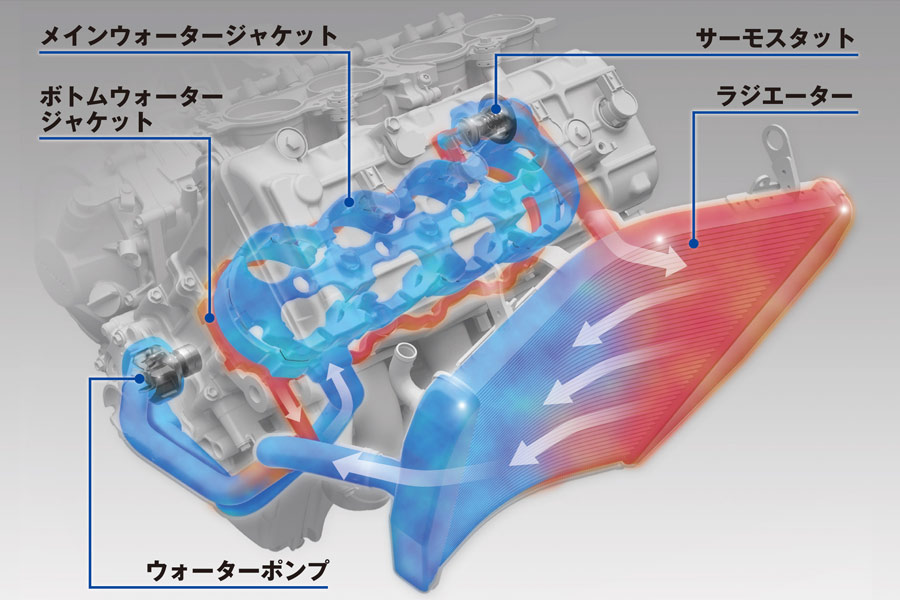 「ビルトインボトムバイパス」のイメージ図。冷却を高めたいシリンダー上部にラジエーターで冷却された水を回し、下部には冷却される前の水を回すことでシリンダーの温度差を低減する機構となっている