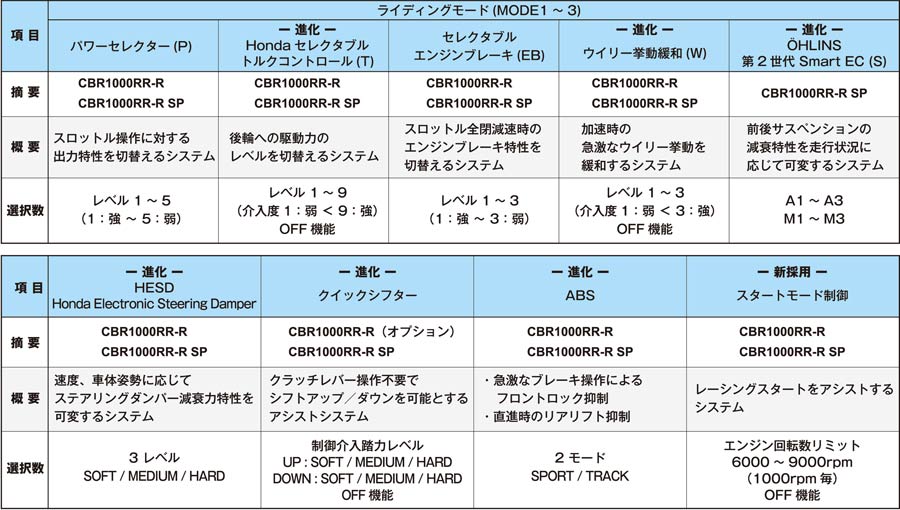 近年のマシンらしく、電子制御も充実している。電気信号で開度をコントロールするスロットルバイワイヤシステム(TBW)や、駆動輪のスリップを制御する「Hondaセレクタブルトルクコントロール(HSTC)」(いわゆるトラクションコントロール)、ウイリーを抑制する制御、ABS、クイックシフターなどを装備。くわえて、レースでのスタート時に、スロットルを全開にした状態で回転数を最適に制御する機能も搭載している。CBR1000RR-R FIREBLADE SPには電子制御サスペンションも備えられており、ライディングモードを切り替えることでパワー特性だけでなく、サスペンションの特性まで一括して調整することも可能だ。