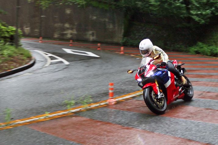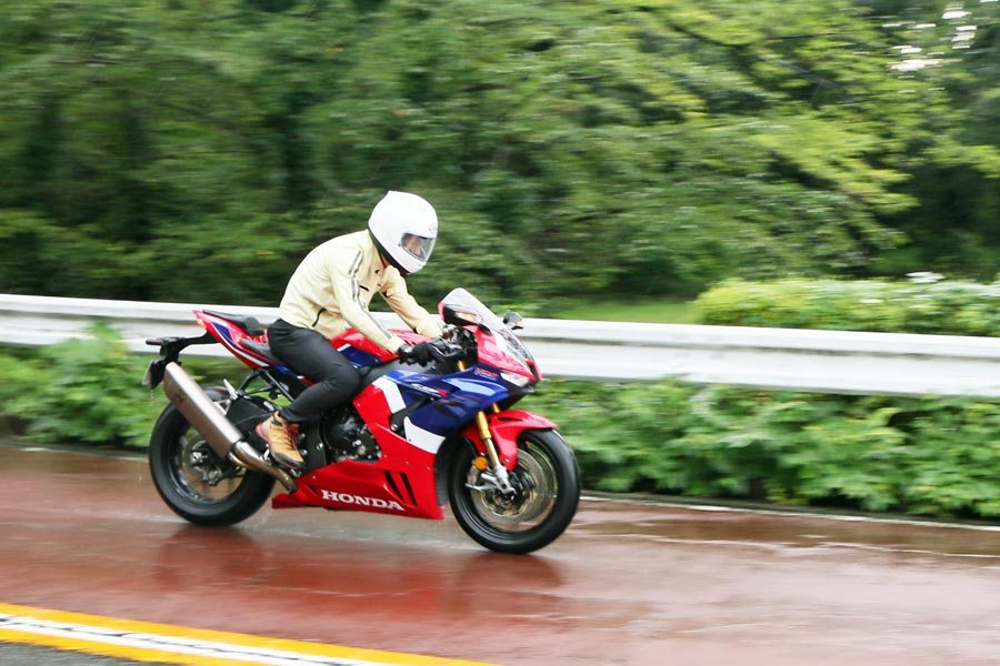 ワインディングに到着しても、絶大な安心感は健在。ヘビーウェットな路面コンディションであってもタイヤが路面をしっかりととらえていることが伝わってくるので、怖さを感じず進んでいける。コーナーでは車体を寝かし込まなくても行きたい方向に視線を向けるだけで曲がることができ、高い運動性を体感。公道なのでレーシングスピードとはかけ離れた速度域であり、フルバンク時の性能などを検証することもできなかったが、それでもワインディングは存分に楽しむことができた。雨上がりで路面に水が流れているような状態にもかかわらず楽しいと思えたのは、レースシーンに向けて作り込まれた車体が、高速域だけでなく低速時の扱いやすさにも効いているからだろう。