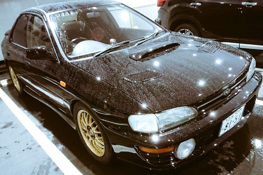 1994年2月登録の愛車、スバル「インプレッサWRX」(初代)の近影です。「全塗装」と「オートグリム」製品により、誇張抜きでショールーム展示車レベルの美しさを発揮! カーライフの楽しさが激増しました!
