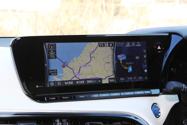 新型MIRAIの内装は、上質だ。インパネのパッドにはやわらかな素材が使われ、そのパッドに沿うようにして金属調の加飾があしらわれており、高級感を漂わせる。また、インパネ中央には大型の「12.3インチTFTワイドタッチセンターディスプレイ」が備えられている。このセンターディスプレイは、画面が横に2分割されており、カーナビの表示とそのほかの情報が分かれて表示されている。これによって、多くの情報を素早く認識することができるのが特徴だ。また、メーターパネルには水素の残量などが表示されるが、燃料電池車だからといって凝ったデザインにはされていない。普通の乗用車と同じような表示なので、すぐになじむことができる。
