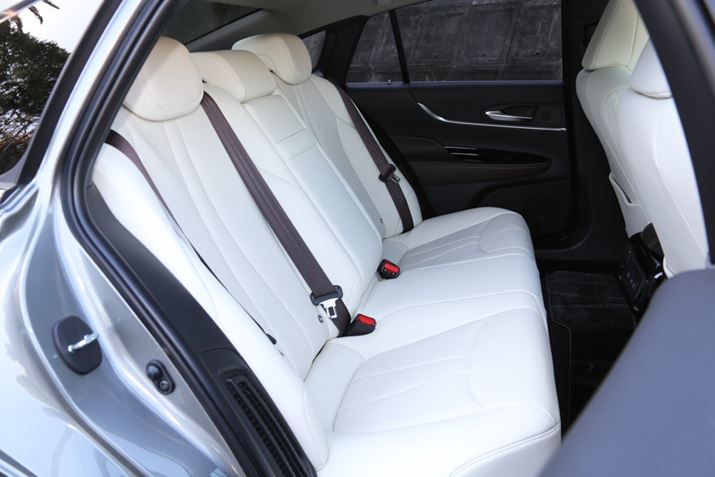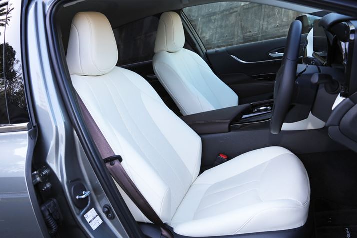 フロントシートの座り心地は、サポート性がいい。シートは、背中から大腿部をしっかりと支えてくれるので、長距離の移動でも疲れにくそうだ。また、リアシートも同様に、乗員の体をしっかりと支えてくれるのだが、クラウンに比べると床から座面までの間隔が少し足りないので、やや膝が持ち上がった座り方になりやすい。さらに、リアシートはトランクスペースの奥に2次バッテリーを搭載していることもあって、取り付け位置が少し前寄りだ。身長170cmの大人4名が乗車した場合、クラウンのリアシートは膝先に握りコブシ2つ半の余裕ができるが、MIRAIは2つ分になる。クラウンに比べると、ホイールベースは同じでも、リアシートの足元空間はMIRAIのほうが少し狭いので、注意したい。