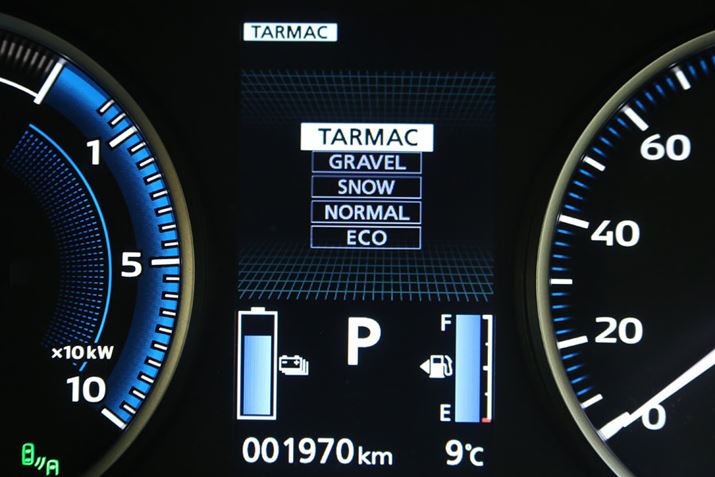 エクリプスクロスPHEVには、「ターマック」「グラベル」「スノー」「ノーマル」「エコ」といった走行モードが用意されている。今回、峠道を走る機会があったのでターマック(舗装された峠道などを走る時に使うモード)を選んで走行してみると、エクリプスクロスPHEVの素性がよくわかった。前後に搭載されたモーターの最高出力と最大トルクは、前輪が82馬力・14kgf-m、後輪は95馬力・19.9kgf-mと、後輪モーターのほうが強力だ。そのため、コーナーの手前で的確に減速して、回り込みながらアクセルペダルを踏み増すと、旋回軌跡を拡大させずに加速していく。ステアリングの操舵角に対して、忠実に回っていく感覚だ。