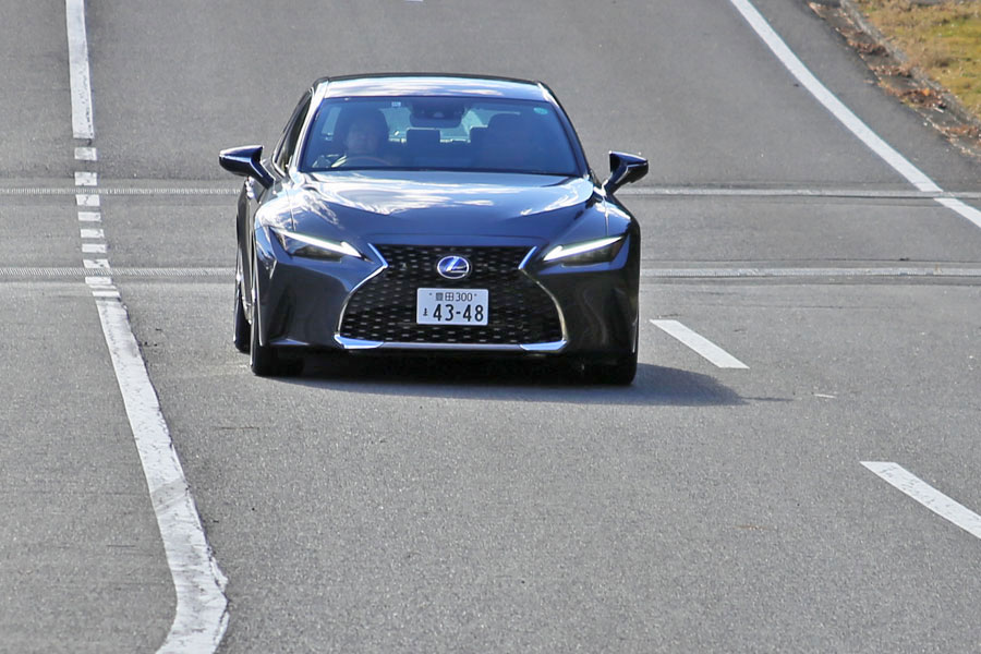 次に、運転感覚をチェックしよう。ISの駆動方式は、マイナーチェンジ前後で変わらず、FR(フロントエンジン、リアドライブ)だ。まず、マイナーチェンジ前と最も大きく変わったのが、乗り心地だ。以前は、大きな段差での突き上げ感は抑えられていたが、路面の細かな凹凸が乗員に伝わりやすかった。高級ブランドであるレクサス車としては粗さのある乗り心地と感じていたのだが、マイナーチェンジ後は細かな振動がうまく抑えられていて、乗り心地が大きく向上している。