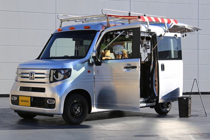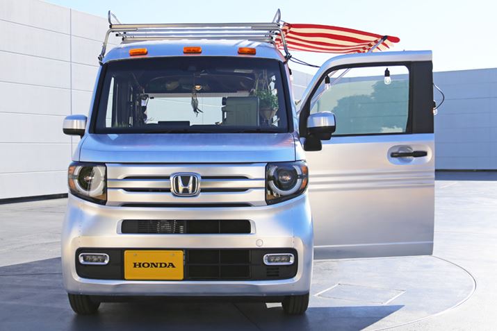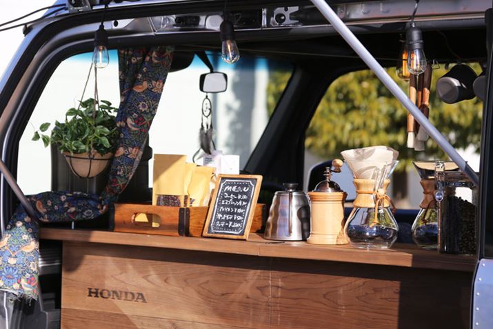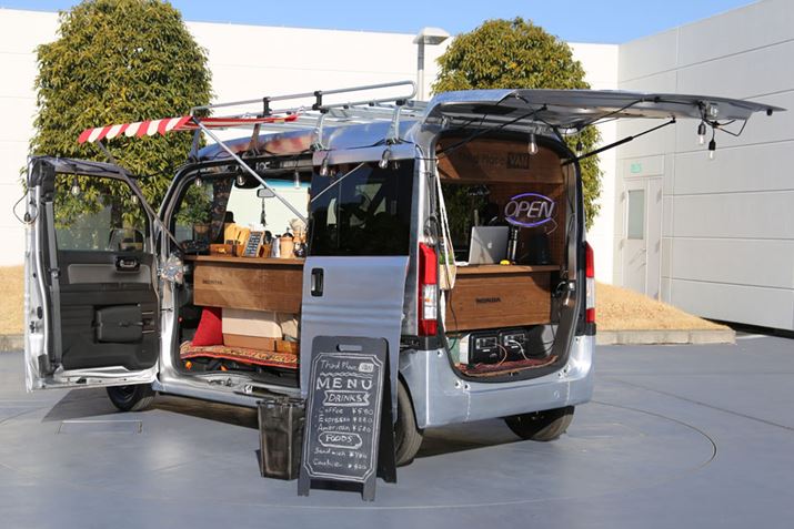 平日はカフェに、休日は旅先での車中泊など、仕事と趣味をシームレスにつなげるトレーラー風カフェとして提案するカスタマイズカーが、N-VANをベースにした「3rd Place VAN」だ。