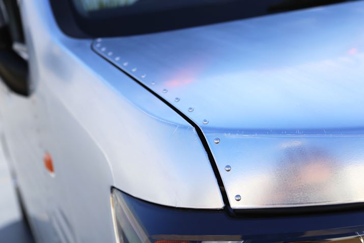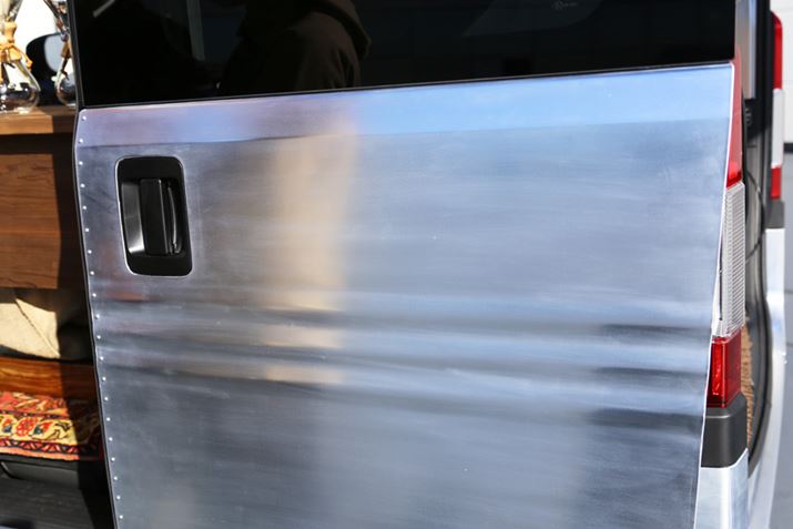 そこから荒木さんは、エクステリアについて「いかにもというような、ピカピカの新品ではなく、少しやれた感じとか、ラギットで少し擦れた、使い古したような感じのアルミの雰囲気を目指しました」と言う。最初に、N-VANのボディにフィルムを貼ったときには、「ピカピカなアルミな感じでしたので、それをやすりでこすりました。ただ、それだけだと白茶けてしまったので、コンパウンドで磨きを出すことで、ちょっと擦れた、やれた感じが出てきました。そのようなことを繰り返して、クルマを仕上げていきました」と説明する。