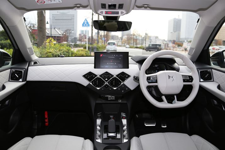 内装にホワイトを使用するとガラス面に映り込むので、通常はここまで大きな範囲で白を使用することはあまりない。しかし、DS3クロスバックE-TENSEでは、黒をうまく使うことで映り込みを抑えているのがわかる。
