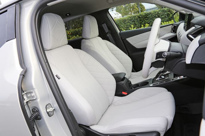 インテリアは白を基調としており、ステアリングまで白というこだわりようだ。さらに、シートも色の統一感を持たせるためにオフホワイトが採用されているが、シートの中央部分は実はファブリックになっており、サイドサポートの部分のみにナッパレザーが使われている。