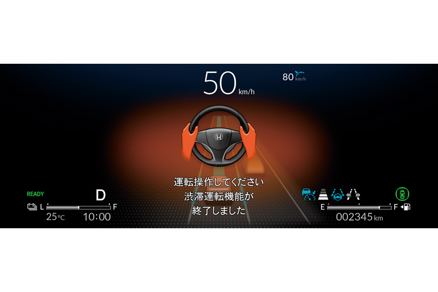 走行速度が時速50kmを超えるとトラフィックジャムパイロットが終了し、モニター画面やメーターにはドライバーが運転操作しなくてはならない状況になったことが表示される。トラフィックジャムパイロットが終了すると、いったんすべての運転支援機能が解除される。技術的には、トラフィックジャムパイロットが終了しても、そのままハンズフリーに戻すことも可能だそうなのだが、ドライバーが切り替わったことを実感しにくい。そこで、運転支援機能をいったん解除して、ドライバーに運転操作をしてもらうようにしたのだという。