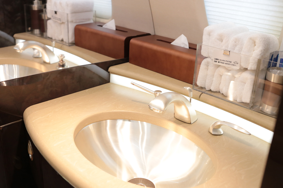 続いて、機体内部を案内してもらうべく、ピカピカに磨かれた機体から下がるタラップをのぼる。タラップの下には赤い絨毯が敷かれ、重鎮になった気分だ。機内に入ると、内装は白に統一されていた。白い革張りの座席とブラウンの木目調の立派なトレイテーブルが備え付けられており、落ち着きと高級感がある。座席のサイズは一般的なエアラインのビジネスクラスの座席と同等だそう。座席は2座席×4列の計8座席だ。