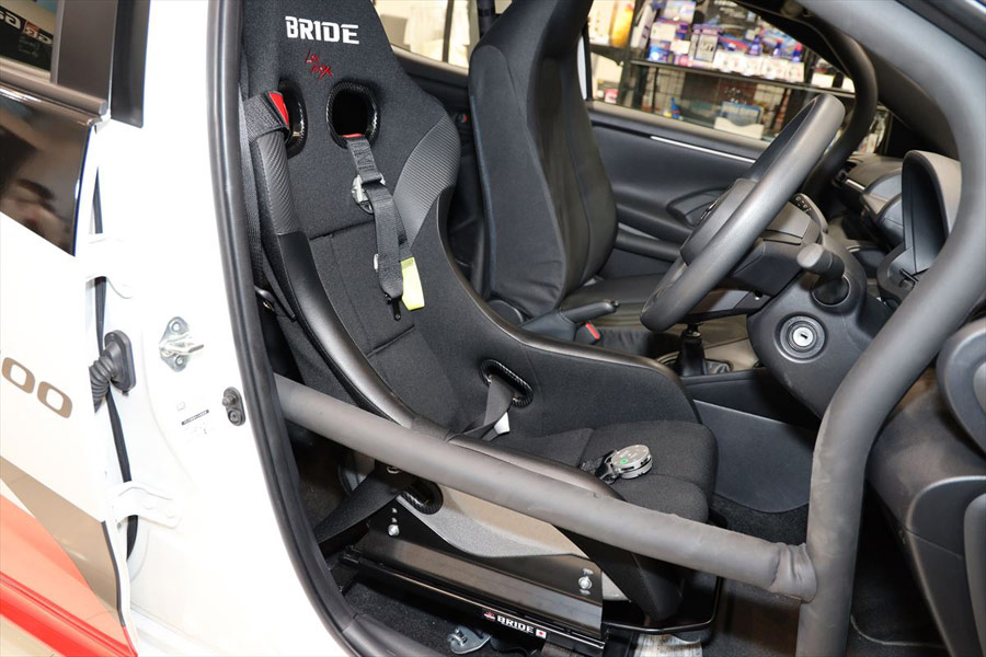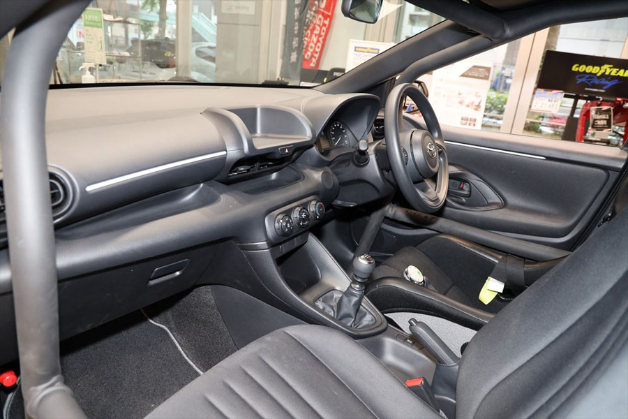 「ヤリスカップカー」に装着されているインパネ非貫通式の6点式「ロールケージ」。運転席と助手席のドア側には、「サイドバー」も備わっています。ちなみに、写真ではBRIDEのフルバケットシートが映っていますが、これは後から装着されたもので、販売時の運転席にはXグレードのノーマルシートが装着されています(後述)