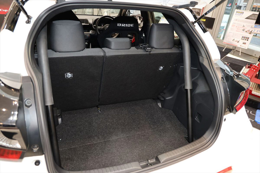 「ヤリスカップカー」に装着されている「ロールケージ」は、ラゲッジルームにまで至ります