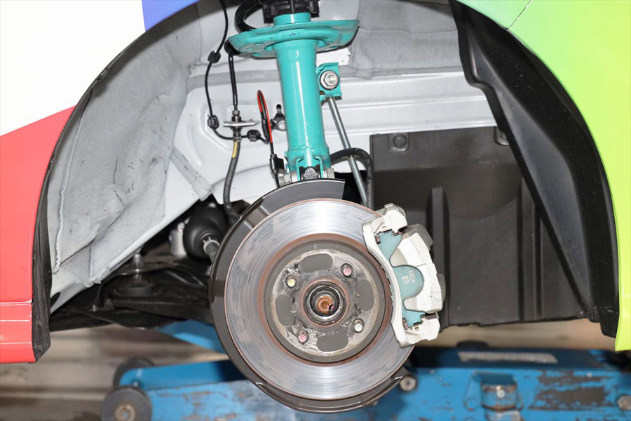 「ヤリスカップカー」のフロントサスペンション。リアサスペンションとともに、内部構造やオイルなどが見直された専用セッティングのものが装着されています