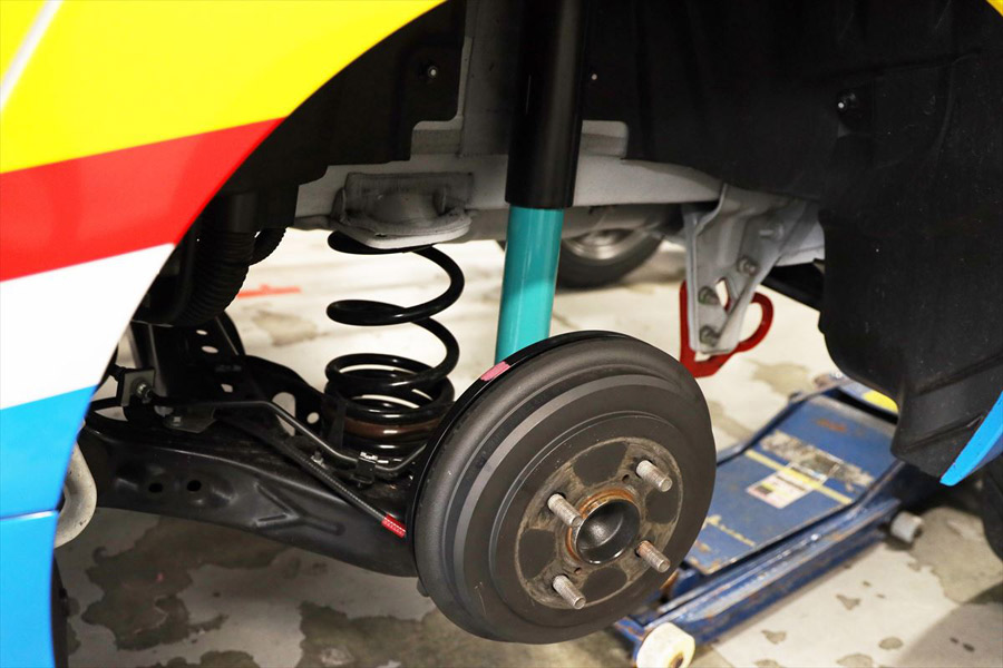 ブレーキは、ブレーキパッドのみ交換することができます。ブレーキローター自体はノーマルヤリスの1.5リッターと同じものなので、レースではブレーキ全体がかなり熱を持つことになります。そのため、ブレーキパッドは耐熱性の高いものを選ぶ必要がありそうです。リアブレーキは、リーディングトレーリング式のいわゆるドラムブレーキですが、レース用のブレーキシューは、さまざまなブレーキメーカーから発売されています。