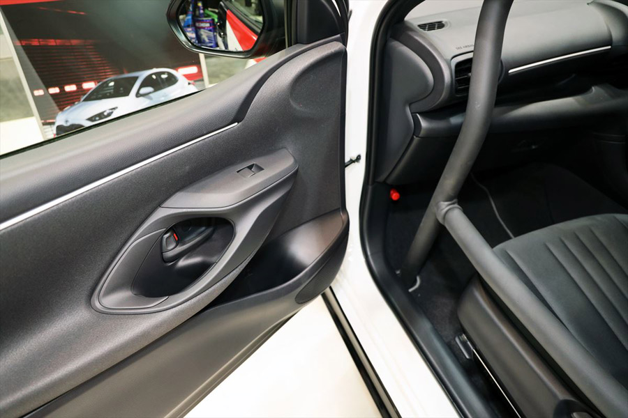 ヤリスカップカーでは、ノーマルヤリスから省かれている装備もあります。車内は、オーディオレス設定となっており、特にディスプレイオーディオなどは後からつけることができません。ドアトリムには2スピーカーが装着されており、ダッシュボード内部に配線は来ていますので「工夫すれば、オーディオを取り付けられるのでは?」と思われる方もいらっしゃるかもしれませんが、レースに出場する際はダッシュボードの形状変更自体ができませんので、注意が必要です。