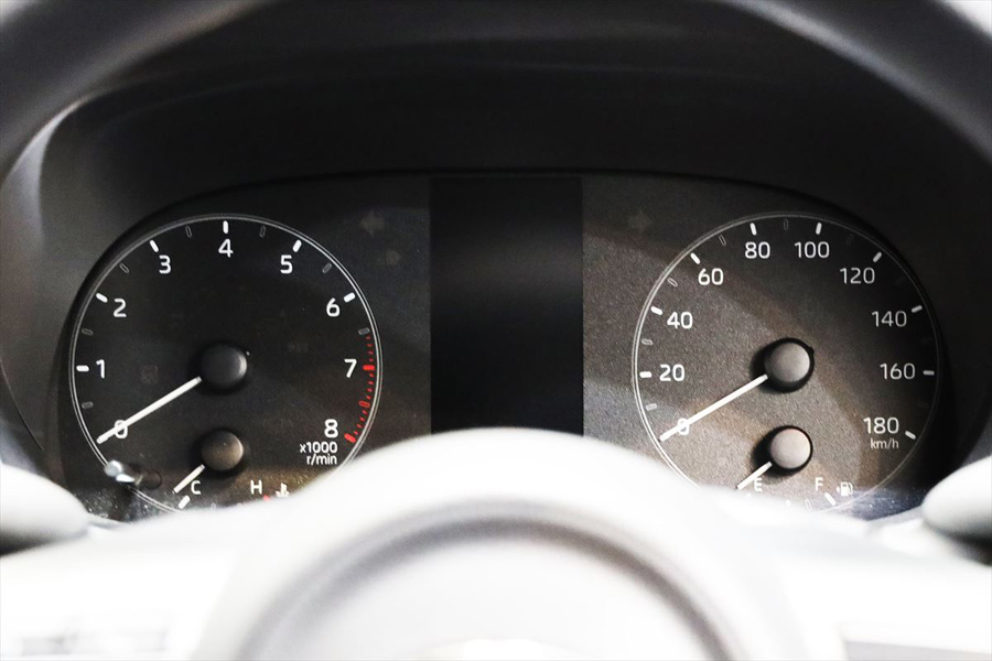 ステアリングは、ヤリスのノーマル形状のものが装着されています。ウレタン巻きの簡素なタイプですが、レーシンググローブをつけての操作となるので、材質に大きな問題はないと言えるでしょう。また、メーターもヤリスのガソリン車と同じものになります。